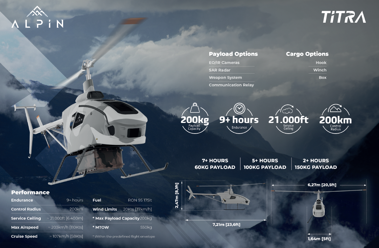 Carry significant amounts of cargo to support operations (up to 200kg with platforms like ALPİN).